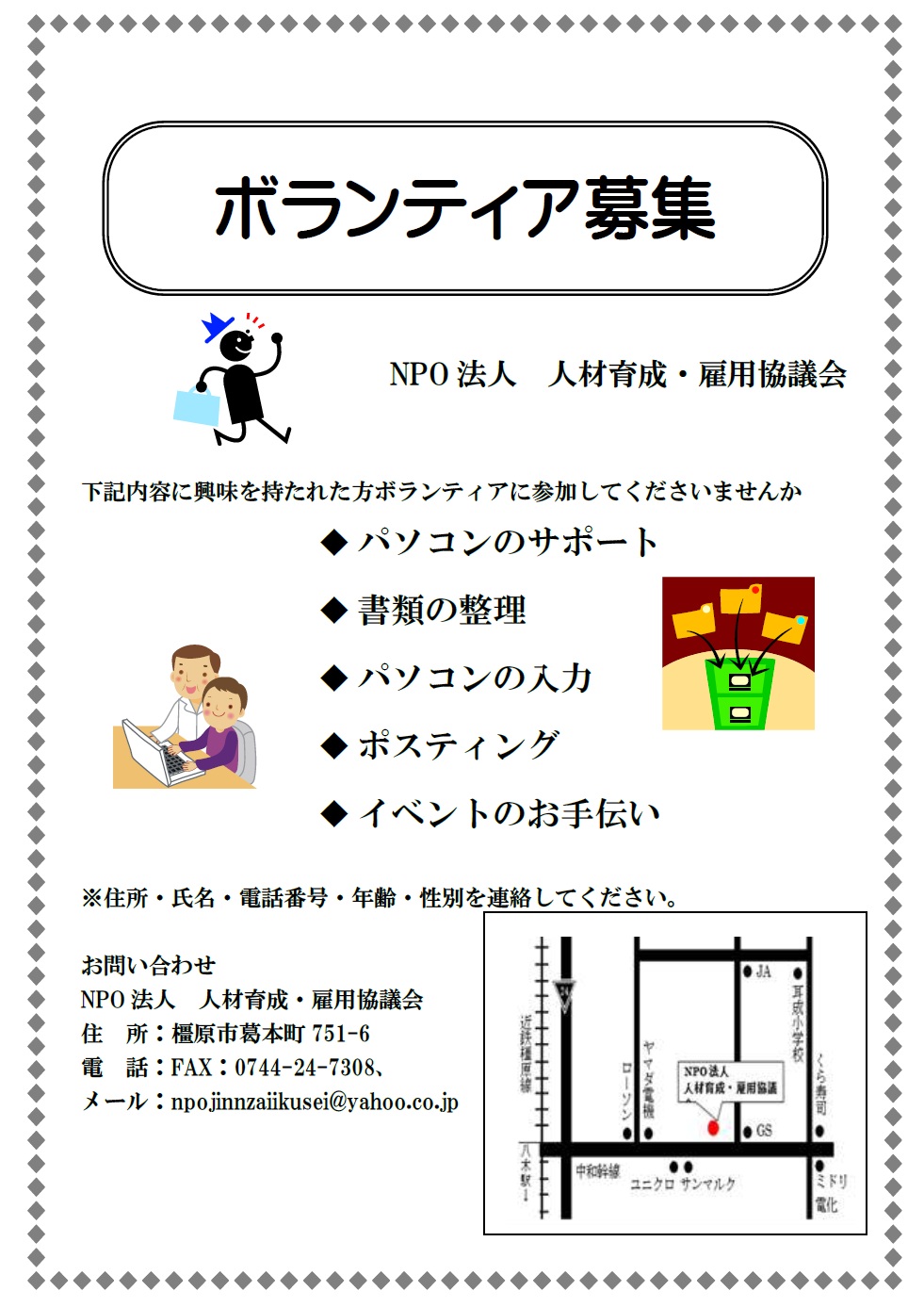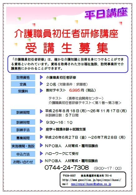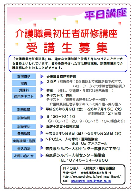 介護職員 初任者研修(平成26年6月開講)奈良県シルバー人材センター協議会)平日講座 ※募集終了しました        募集チラシ